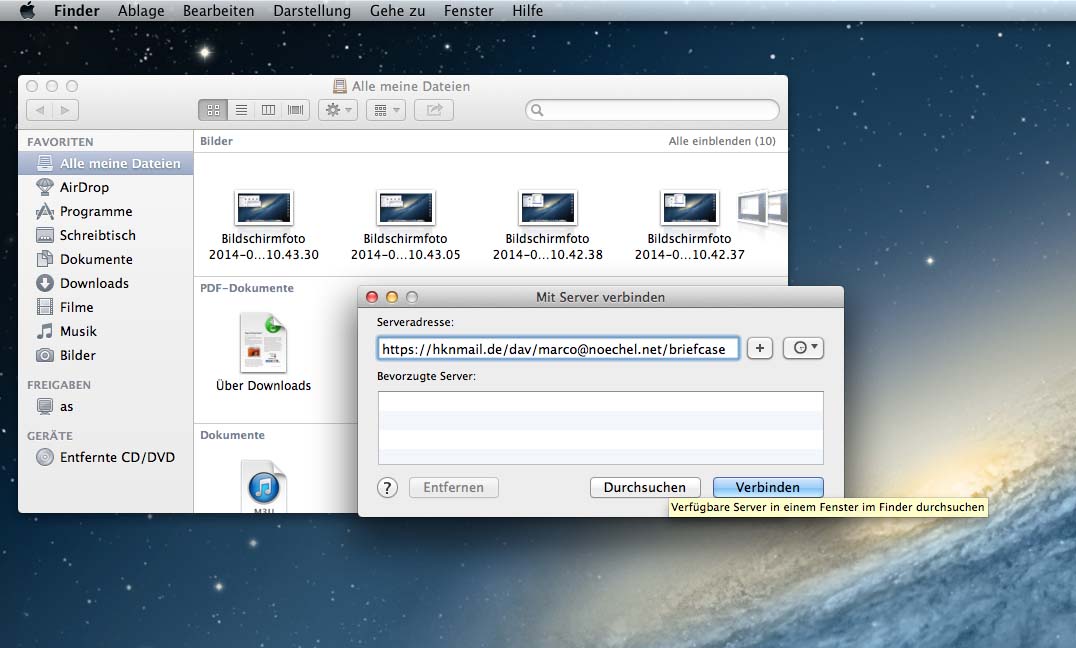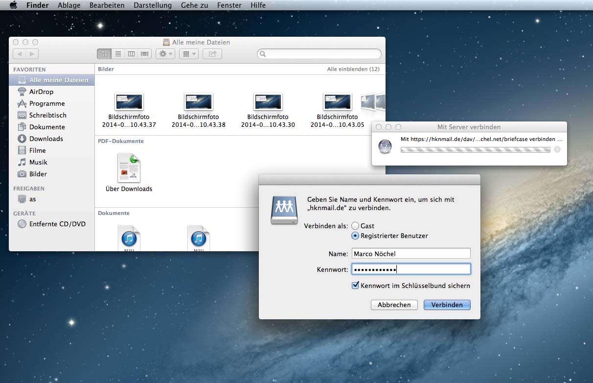 Natürlich schreibe ich nicht alles online. Also brauchte ich noch den Zugriff auf meine Dateien. Da ich die nicht jedes Mal über die Cloud-Office-Weboberfläche runterladen möchte, versuchte ich, sie als Laufwerk zu verbinden. Das gestaltete sich glücklicherweise als sehr einfach. Im „Finder“ konnte ich mit wenigen Klicks die Cloud-Office-Dateien als Server verbinden. Wie das geht, siehst Du hier in der Galerie.