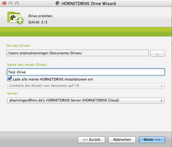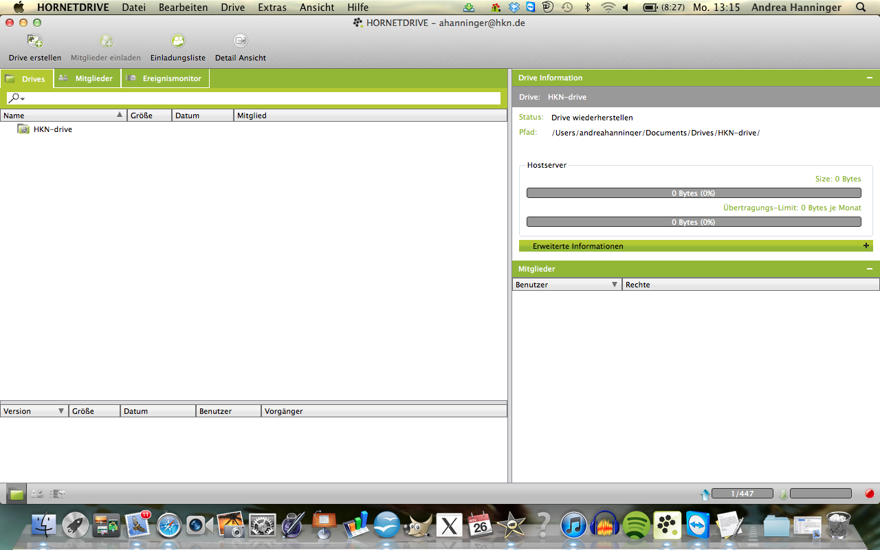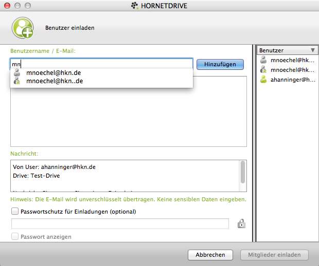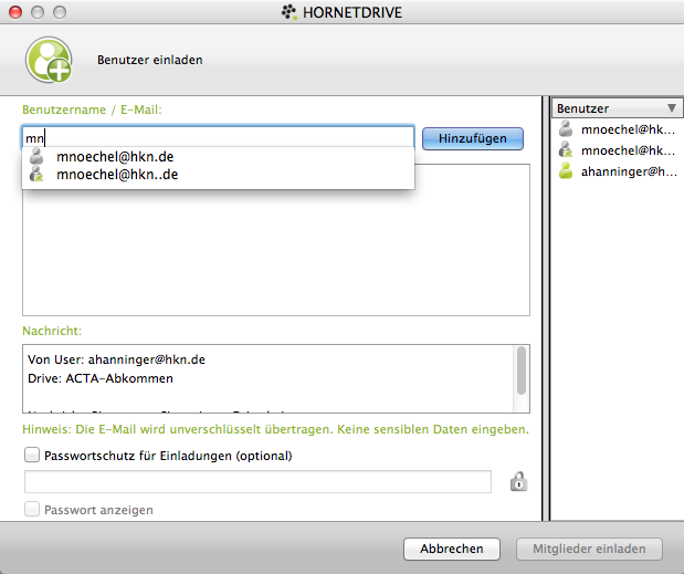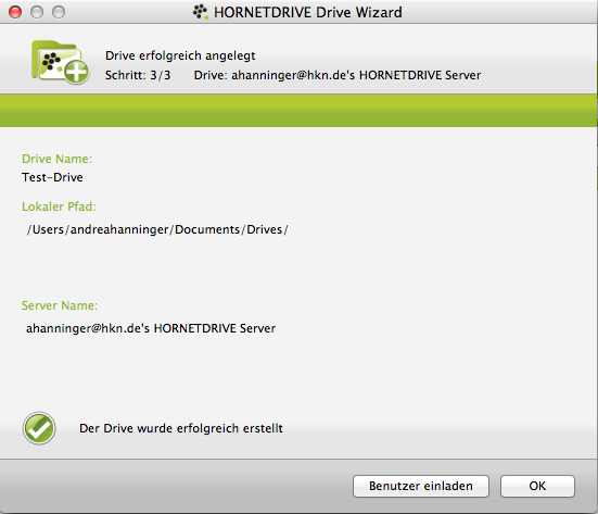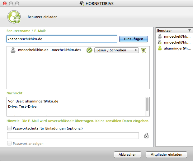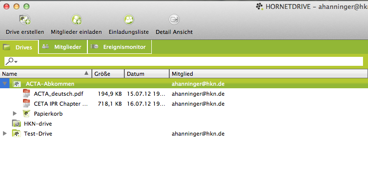 Natürlich kann man Drives auch mit anderen teilen. Nutzt der andere auch HORNETDRIVE, findet er Einladungen zur Zusammenarbeit in seinem HORNETDRIVE-Client. Nutzt der andere Hornetdrive noch nicht, bekommt er eine Einladung sich eine kostenfreie Version runter zu laden. Diese existiert allerdings derzeit noch nicht. Zumindest funktioniert der Link in der Einladungs-E-Mail nicht.
