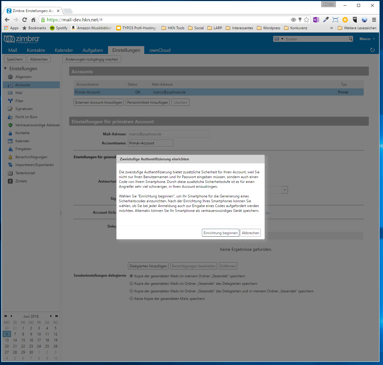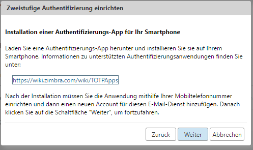 Das Prinzip ist bei jeder erst Einrichtung gleich. Du aktivierst die Zwei Faktor Authentifizierung und installierst die die App. Dann bekommst Du einen Code vom Zimbra-Webmailer, den du in deiner App eingibst. Danach bekommst du einen sechsstelligen Code von der App, den du im Webmailer einträgst. Das ist schon alles. Ab jetzt ist ein zimbra Bett melodisch die Zwei Faktor Authentifizierung geschützt.